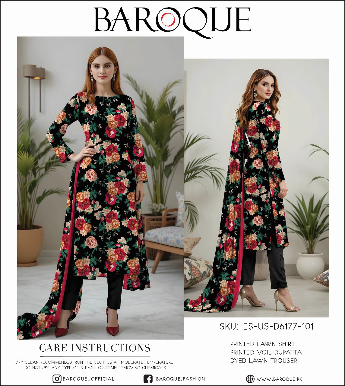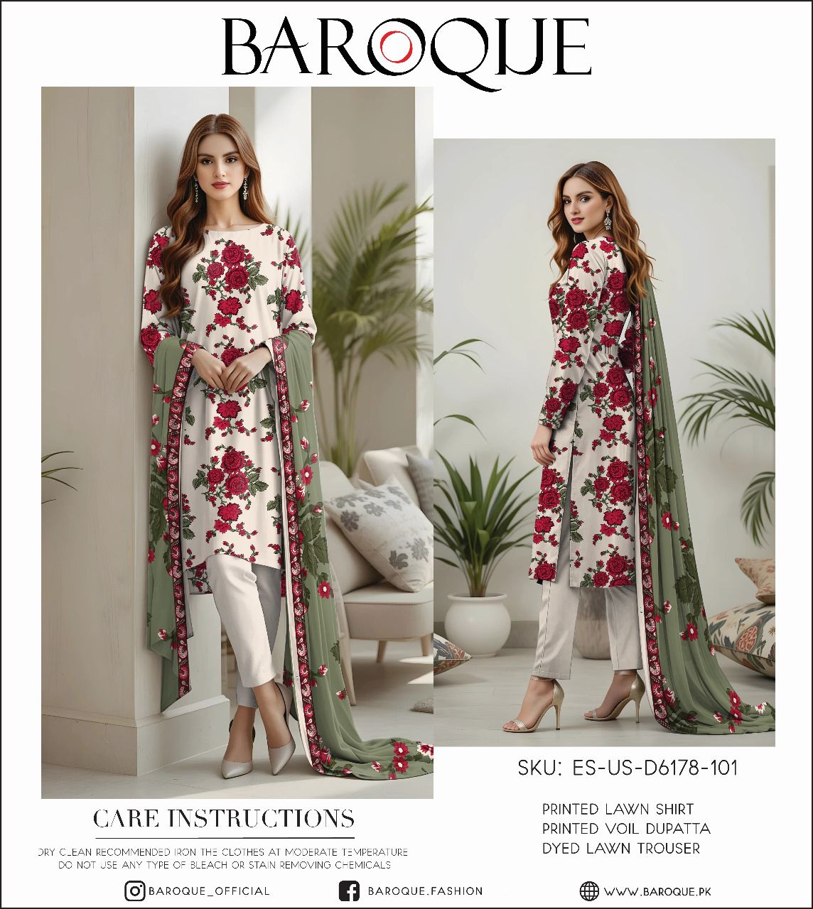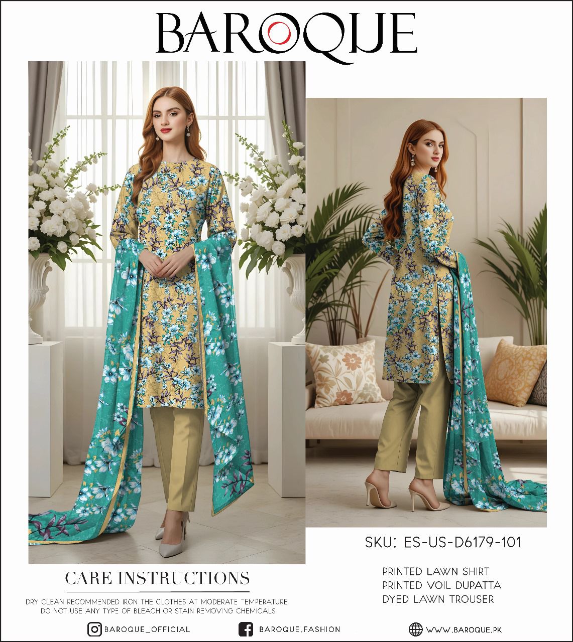 • Shirt: Printed Lawn – Soft, breathable & designed with signature Baroque artistry